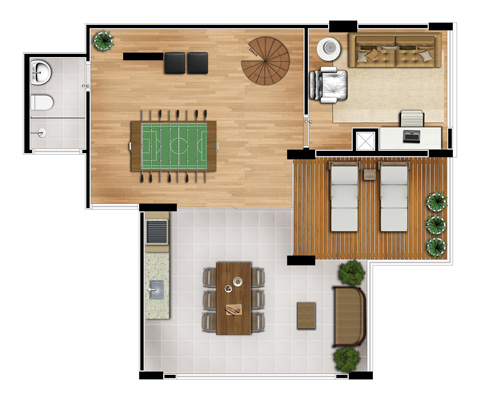 Também estão disponíveis quatro unidades duplex, na cobertura, com área de 143,46m² e vários ambientes adicionais.